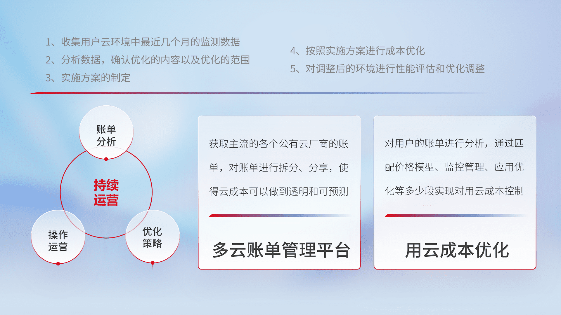 通过多云纳管,,,以统一的资源数据模型把客户的云资源进行抽象和封装,,,,进而实现对多云资源的统一操作,,,,保障云资源管理的可靠性、、稳定性与可用性。。。量身定制化运维内容,,配置、、、、开发运维、、、补丁管理、、、、备份、、监控、、、、认证和访问管理、、审计和日常巡检等,,,,保障在用云过程中的可靠度,,稳定度以及高可用率。。。。