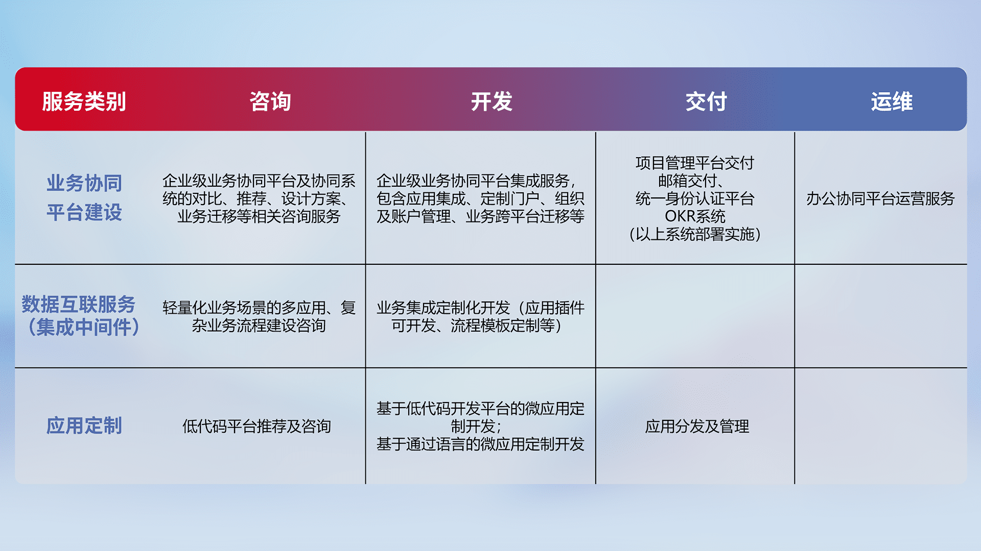 针对钉钉、、、、企微、、、IDaas等平台级产品提供产品的规划、、、方案、、、交付、、、定制化开发等服务,,,,实现如统一协同办公、、、、智能客户服务、、、混合会议管理、、、、智能数据查询、、、、等业务场景,,,,实现数字化转型。。。。
